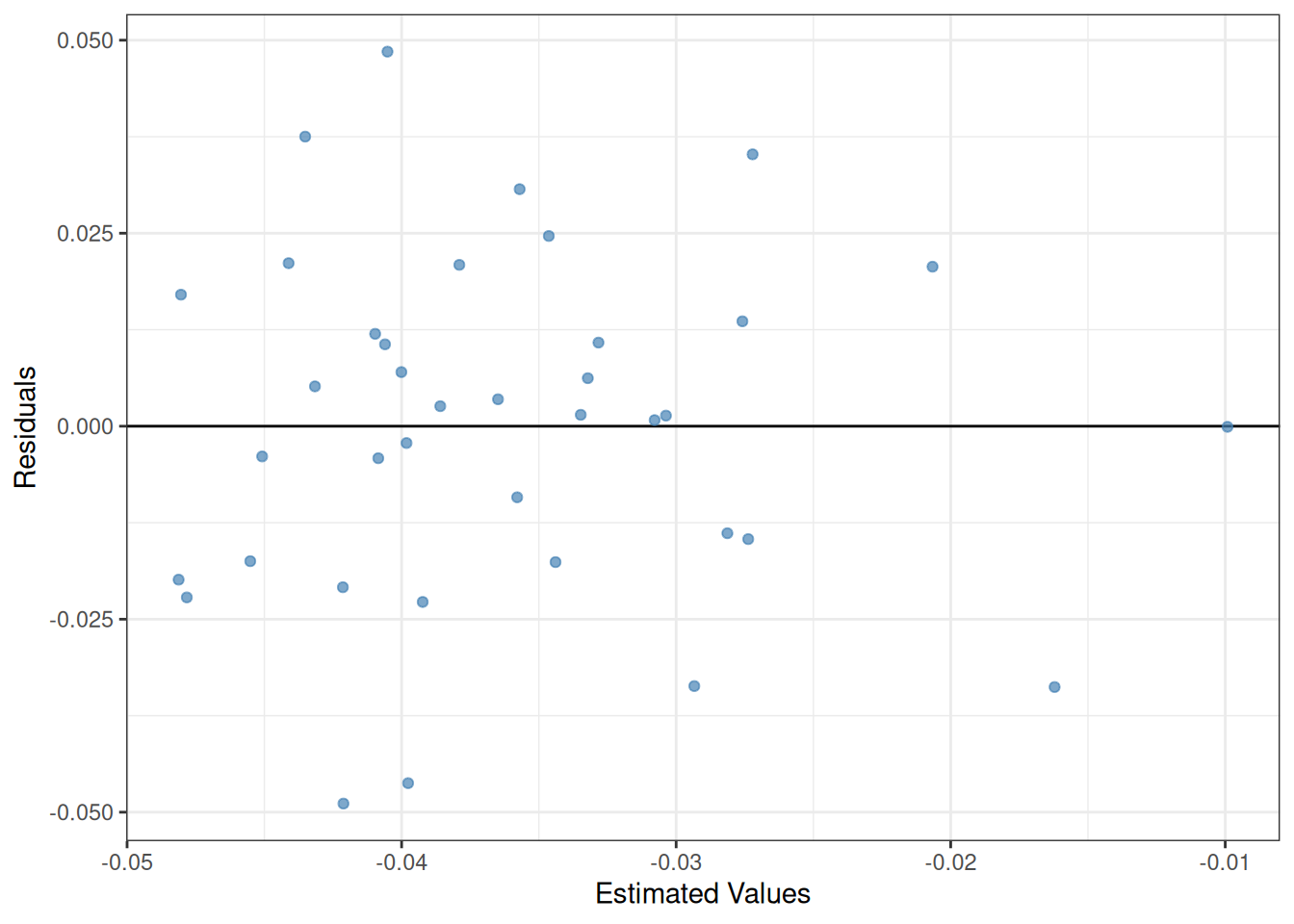 Next, it is very useful to display the residuals against the fitted values. If the points have no trends of increase, decrease, valleys, or humps, and the spread of the points is roughly constant, then they adhere to the assumptions of linear regression. In this case, it would be hard to argue that any trend is due to something else than chance: