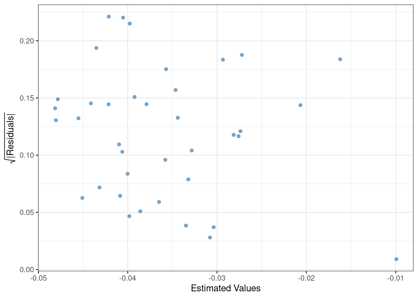 Finally, there is a diagnostic plot that is a slight variation on the above. The difference is that it works with the absolute values of the residuals. This is done because, since residuals will by definition be more or less symmetrically distributed around zero, one can effectively double the precision of the diagnostic by focusing only on magnitudes. For statistical reasons that do not concern us here, the square roots of these absolute values tend to behave much better, which is why we see the square root being taken along the y-axis: