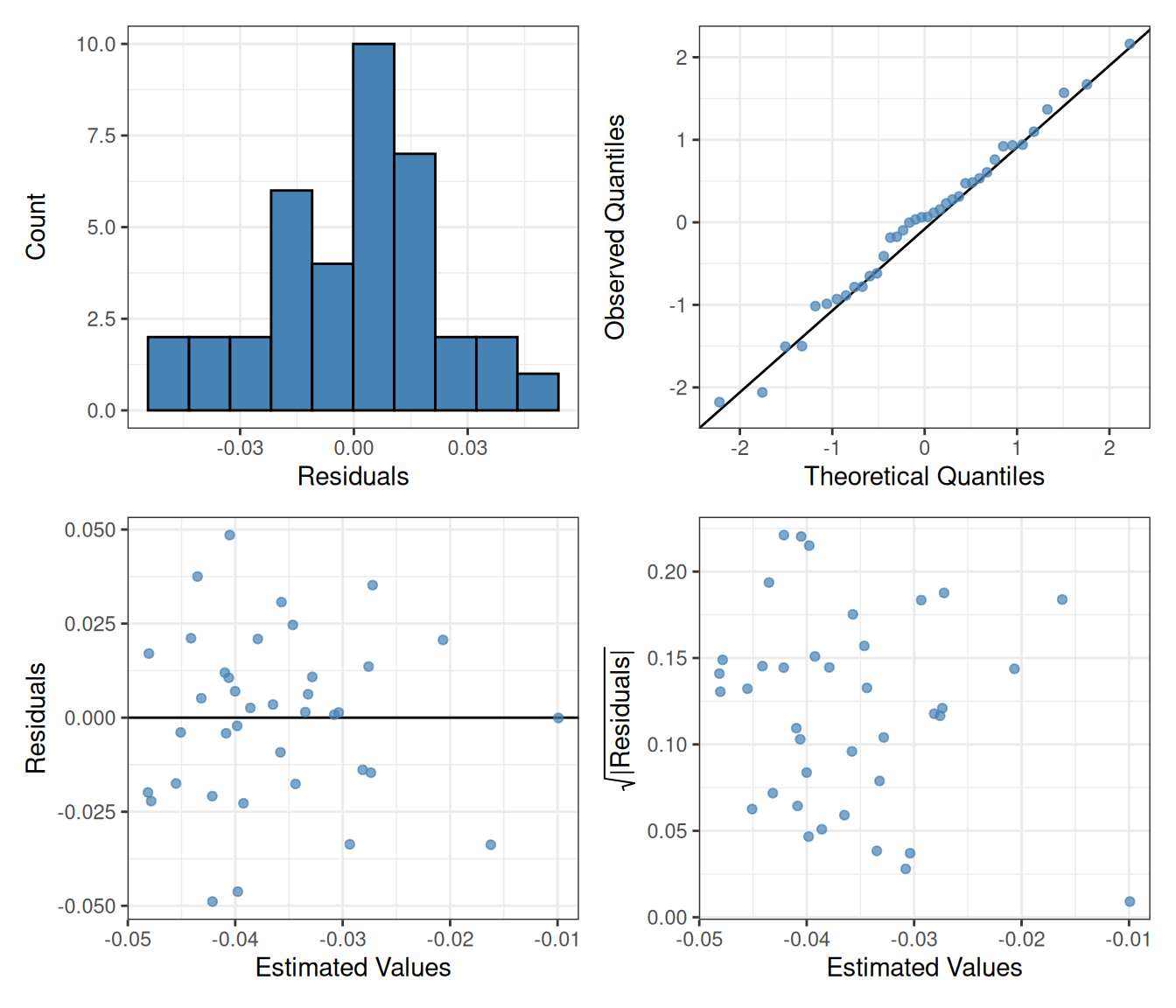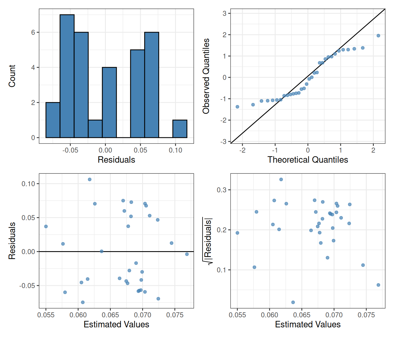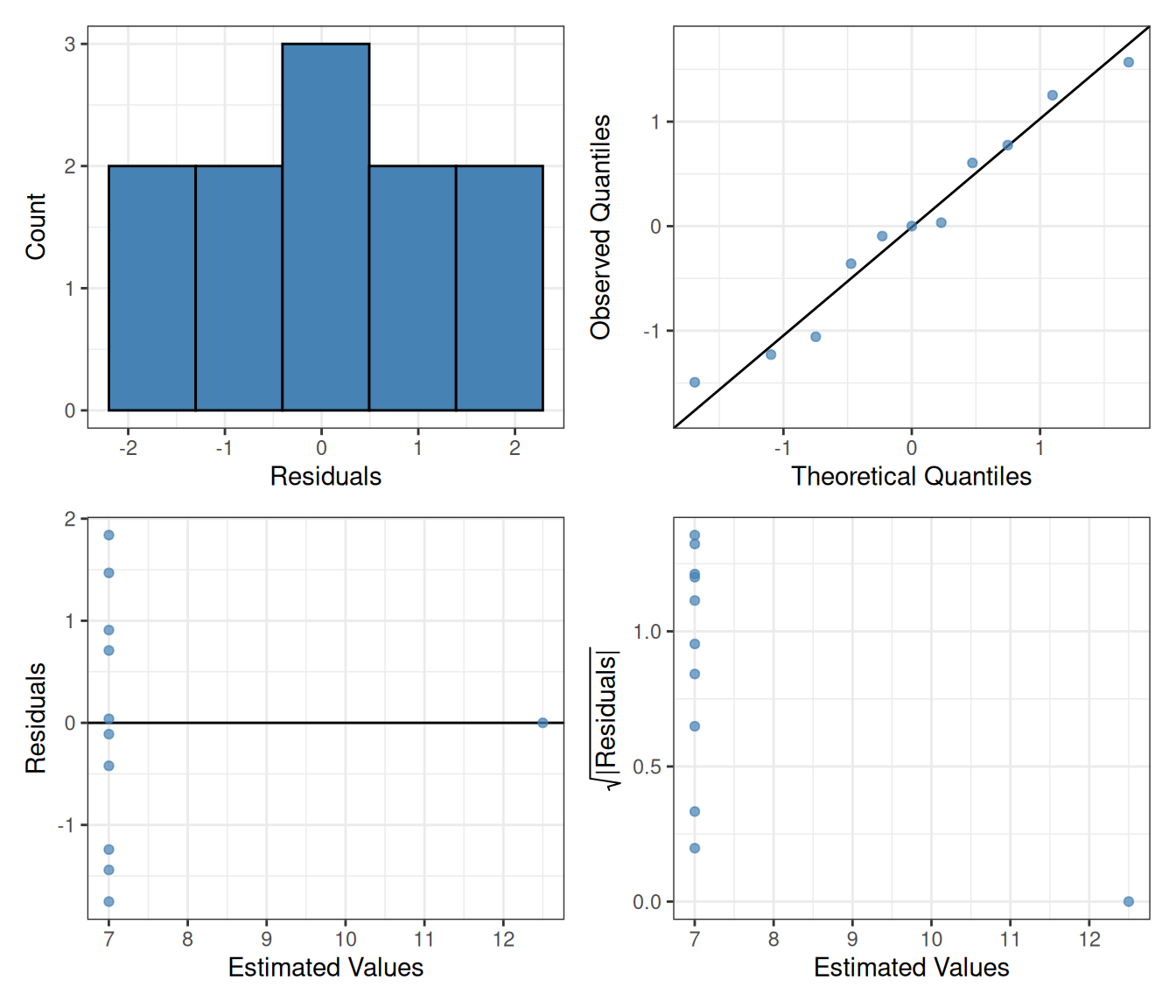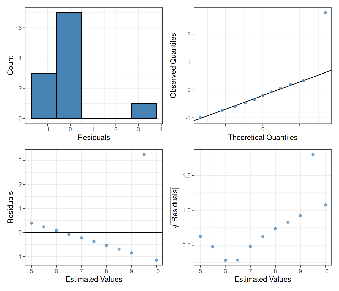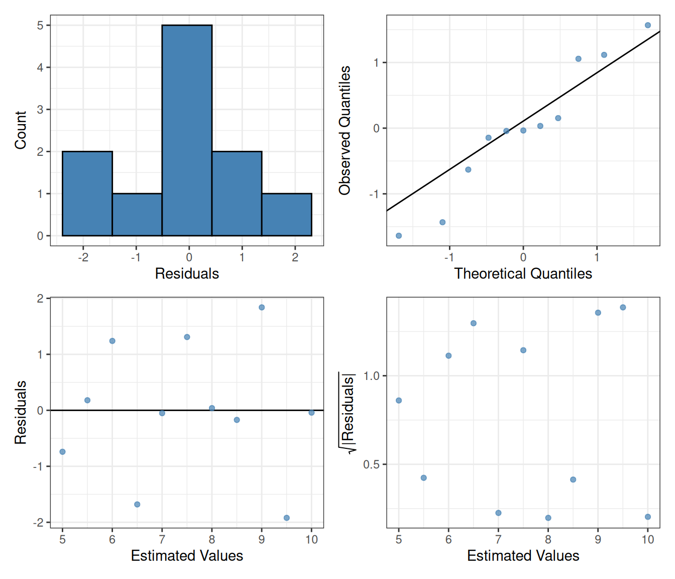 Combining the plots above, we can write a hand-crafted custom function which takes a linear model object and generates all four plots (see the box below for its source code). We will be relying on this function from here on.