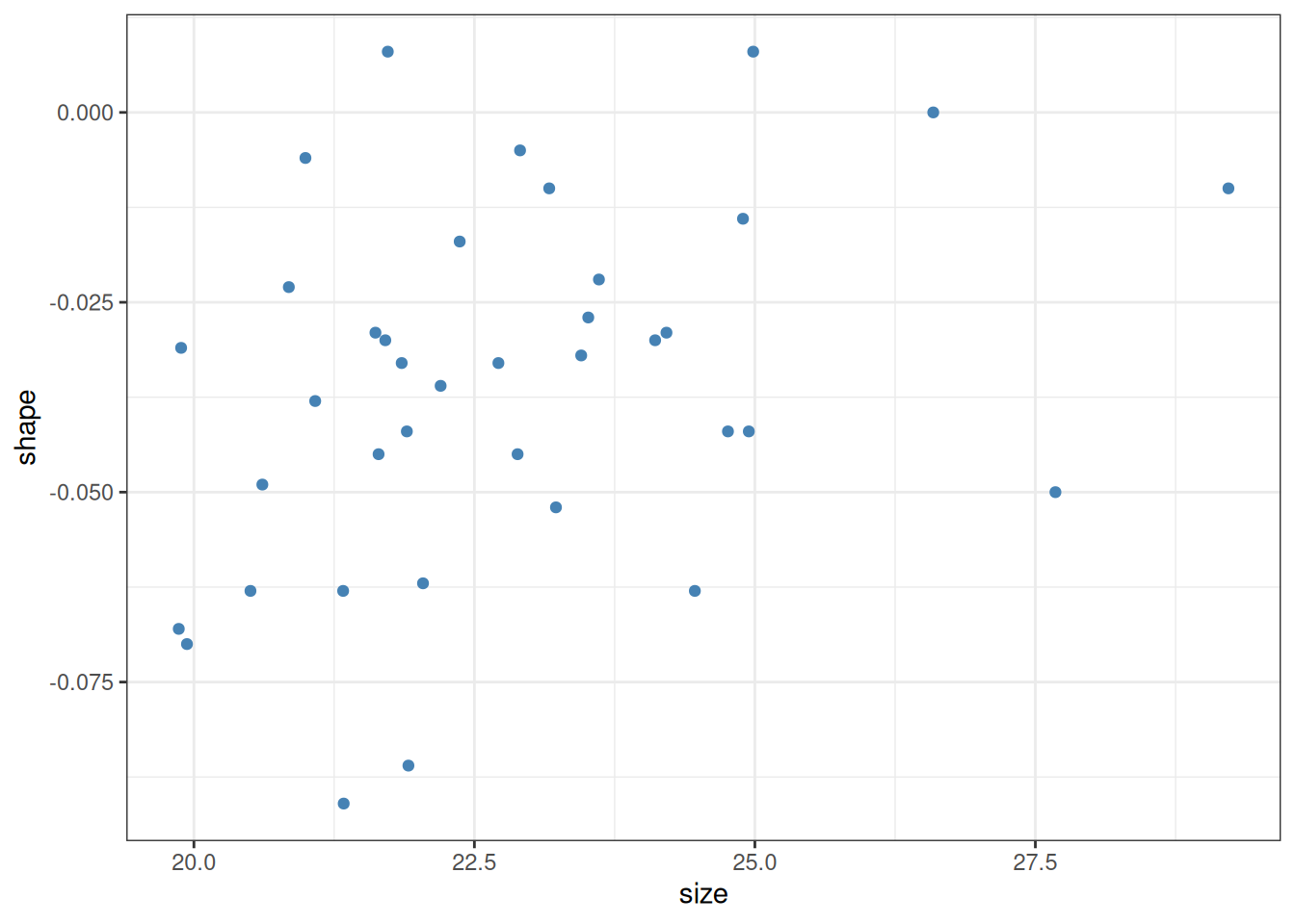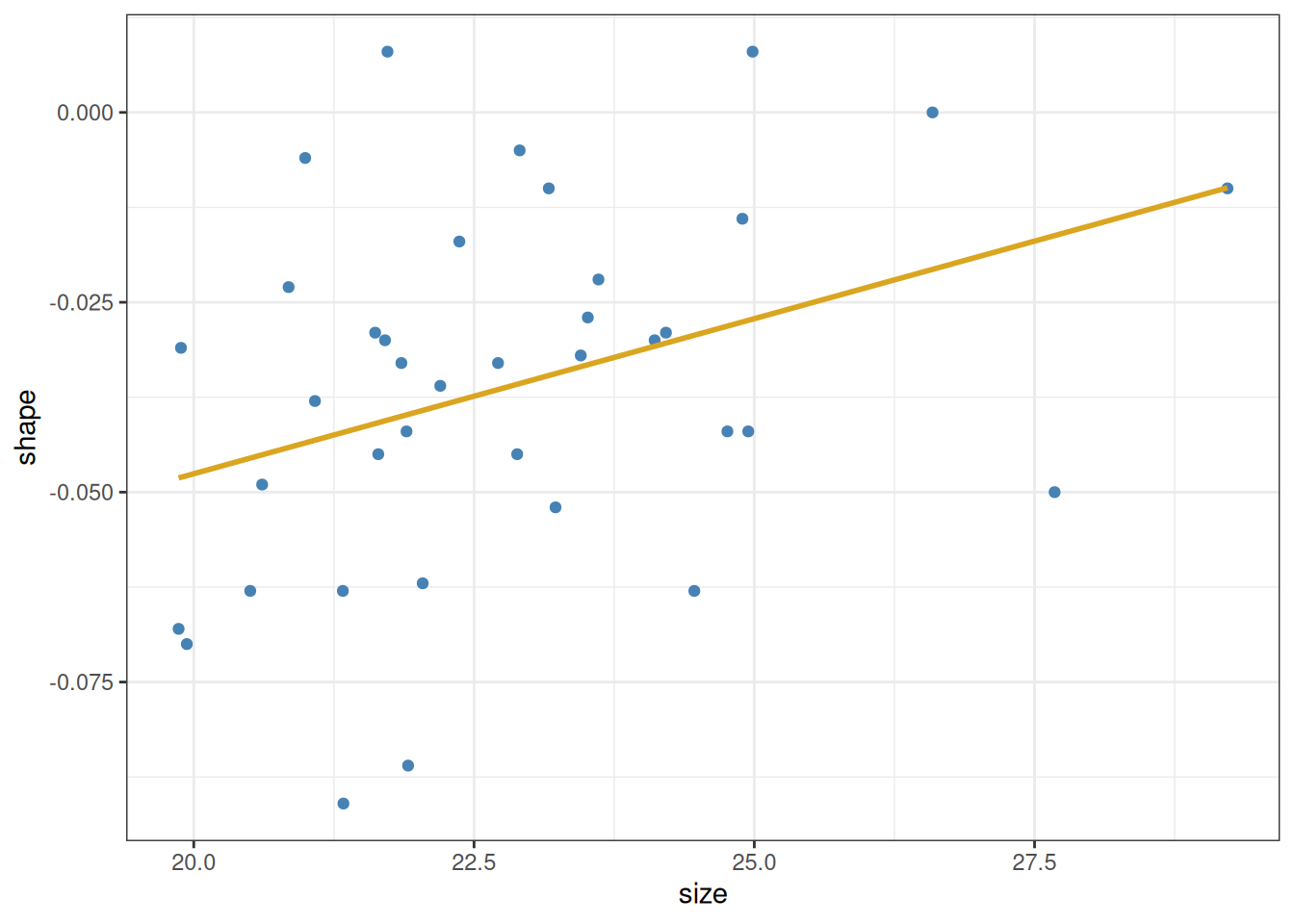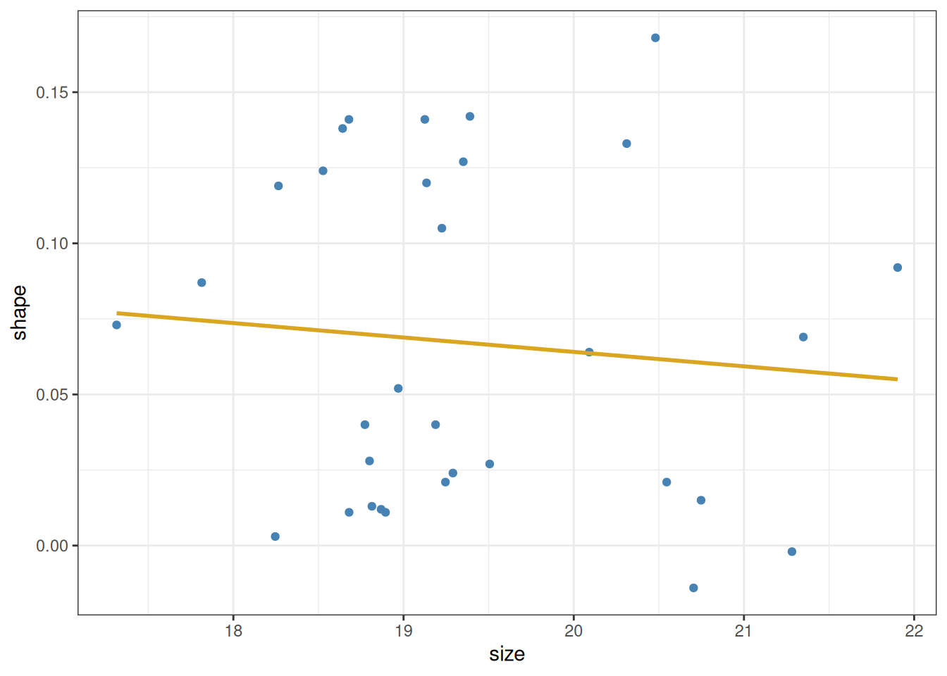 The second purpose is to be able to say whether there is any actual relationship between the response and the predictor (here, shell shape and shell size). Let us look at the plot again: