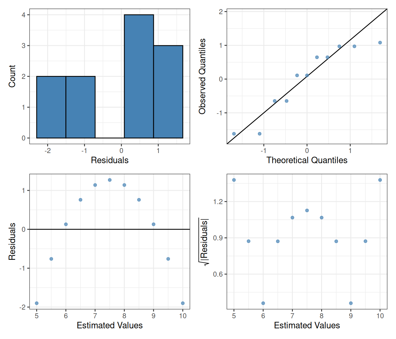 The data have been carefully crafted so that the least-squares regression line has an intercept of 3 and a slope of 0.5 for each of the four sets. Furthermore, the p-values are also identical to many decimal places. But this visual representation reveals what would have been much harder to intuit otherwise: that only the first set has a real chance of conforming to the assumptions of linear regression. Performing the regression on just this set and creating diagnostic plots: