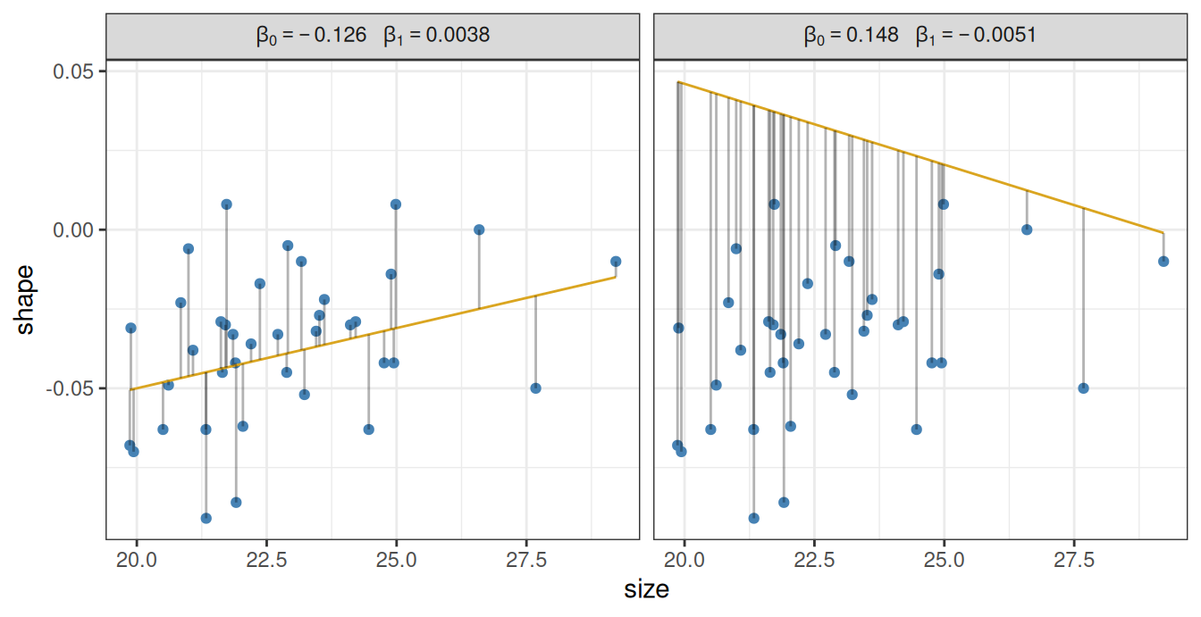 The purpose is twofold. First, we want to be able to make useful predictions using the data. By finding the best-fitting line, we are able to say: “increasing the shell size of an N. nux individual by one unit contributes, on average, \(0.0041\) extra units to the shape”. Of course, any such prediction is to be used within a limited range. For example, with the coefficients \(\beta_0 = -0.129\) and \(\beta_1 = 0.0041\), it would follow that a snail of size zero would have a predicted shell shape of \(y = \beta_0 + \beta_1 \cdot 0 = \beta_0 = -0.129\). But a shell of size zero cannot have any sort of shape (obviously). The implication is clear: for shell sizes that are close to the range of observed values, one can use the linear model as an approximation, but beyond that range it can easily break down. This is important to keep in mind at all times when interpreting regression results.