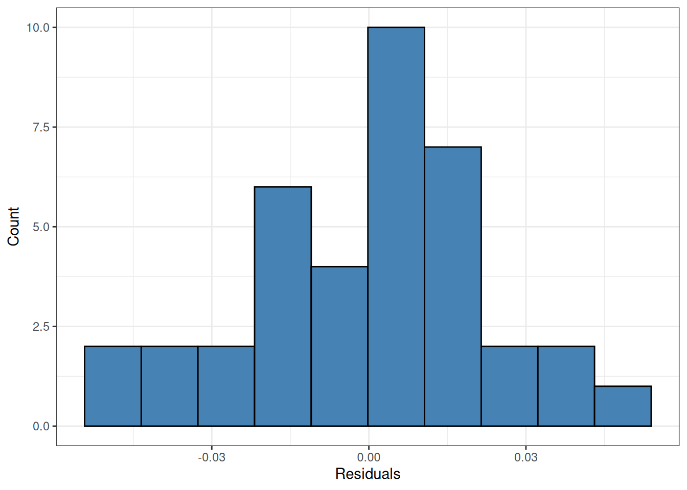 The simplest one is to look at a histogram of the residuals. This can reveal at a glance whether the residuals are centered at zero, and whether they follow a symmetric, approximately bell-shaped curve (normal distribution):