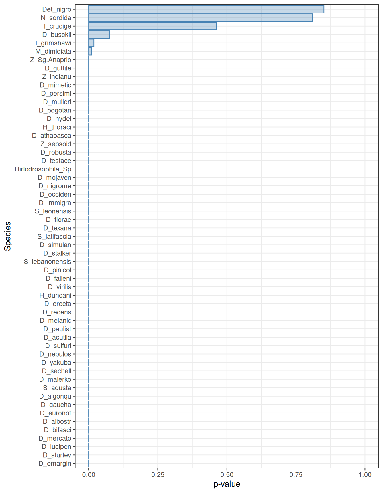 This graph shows that most species have very small p-values, but that there are four clear outliers. We can extract the names of these outlier species: