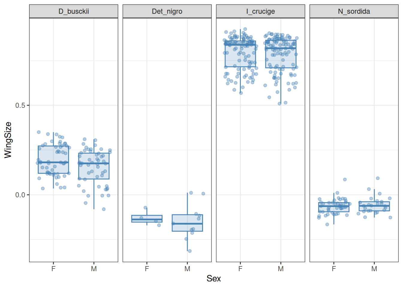 For D_busckii, I_crucige, and N_sordida, it is difficult not to conclude that the high p-values indicate the lack of a meaningful sex difference in wing length. For Det_nigro on the other hand, there are very few sampled individuals. Therefore one would most likely need more data to say.