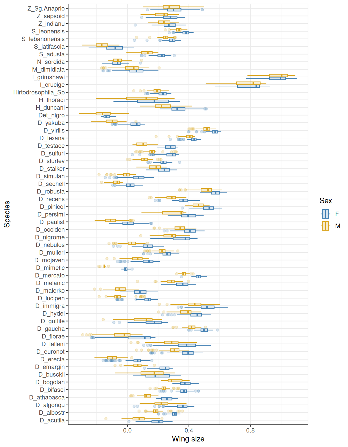 outlierSpecies <- fly |>nest(data =!Species) |>mutate(test =map(data, function(x) wilcox.test(L2Length~Sex, data=x))) |>mutate(test =map(test, tidy)) |>unnest(test) |>arrange(desc(p.value)) |>slice(1:4) |># Choose first 4 rows from the sorted tablepull(Species) # Get the 4 species namesprint(outlierSpecies)